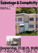 2025 Do. 23. Oktober Vortrag Sabotage & Complicity — 019 Gent: Tomas Lootens Institut für Architektur, F-Nische, F400, Trakt IV, Technikumstrasse 21, 6048 Horw – 18:00 Uhr Vortrag Sabotage & Complicity — 019 Gent: Tomas Lootens