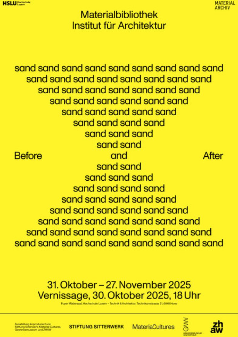«Before and After Sand» wurde vom Werkstoffarchiv des Sitterwerks St. Gallen in Zusammenarbeit mit der Londoner Architekt:innengruppe Material Cultures, mit einem Film von Leo Dawson und Emma Rishøj Holm konzipiert. Das Gewerbemuseum Winterthur, die ZHAW sowie die HSLU T&A erweitert die Ausstellung mit zusätzlichen Projekten, Stationen und Exponaten.