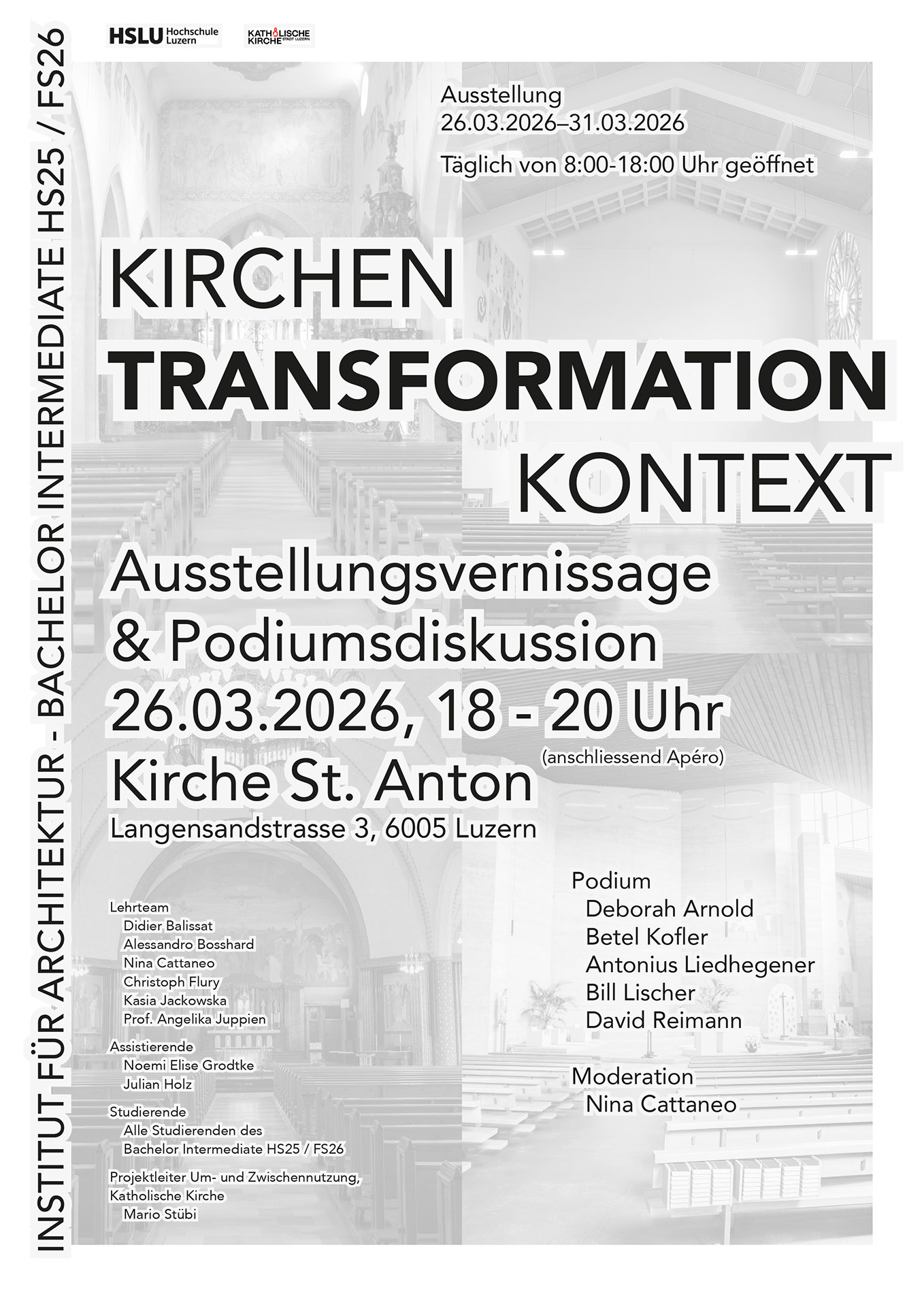 Die Ausstellung zeigt experimentelle Entwurfsprojekte von Studierenden des Bachelor Intermediate aus dem Herbstsemester 2025 zur möglichen Umnutzung von vier Luzerner Kirchen – St. Maria, St. Paulus, St. Michael und St. Anton – zu Wohnraum. Dabei geht es nicht nur um die Anpassung der baulichen Substanz an neue Funktionen, sondern auch um die Reflexion der historischen und kulturellen Bedeutung dieser Gebäude. Ziel war es, diese Fragen offen zu diskutieren und räumliche Antworten zu entwickeln, die den bestehenden Kontext respektieren und zugleich neue Perspektiven eröffnen.
